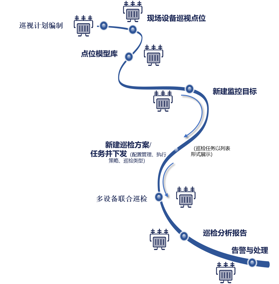 同時(shí),針對(duì)變電站內(nèi)攝像機(jī)、機(jī)器人、無(wú)人機(jī)、在線監(jiān)測(cè)等多種感知及智能巡視設(shè)備間缺乏聯(lián)動(dòng)機(jī)制現(xiàn)象,江行智能開發(fā)變電遠(yuǎn)程智能巡視系統(tǒng),可將上述多種智能巡視設(shè)備納入系統(tǒng)管控,并設(shè)計(jì)聯(lián)合巡檢策略,最大程度挖掘智能設(shè)備價(jià)值,提升設(shè)備利用率及巡視作業(yè)智能化水平。