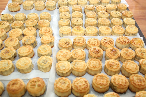 一個制作小組專門負(fù)責(zé)稱面團(tuán)、稱餡料。另一組負(fù)責(zé)包餡、壓模,先將棗泥、板栗、紫薯、豆沙等餡料揉成團(tuán),壓扁,放上一枚蛋黃,包好之后再用面皮裹上,搓圓之后,壓模成型。他們分工明確,各司其職,一個個精致月餅在他們手中誕生。將排列整齊的月餅放進(jìn)烤箱,8到10分鐘后開烤箱,刷上一層蛋液,再烤4到5分鐘,色香味俱全的手工月餅便新鮮出爐了。“真好吃!”“這枚中秋的‘小月亮’啊,又甜又香!”“包餡的時候要注意排空氣,不然,烤的時候容易裂開。”大家迫不及待嘗試自己的手藝,一邊不忘交流制作心得,自己動手DIY的成就感寫在每個人的臉上,活動現(xiàn)場滿滿的都是快樂和幸福的味道。