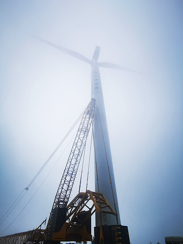 該項目自2021年8月2日全面開工建設以來,全員克服時間緊、任務重,以及夏季長時間高溫、近期溫度驟降、山上風力較大等重重困難,縝密部署,團結拼搏,以扎實的管理、良好的協(xié)調、有力的措施,特別是針對作業(yè)高峰期充分討論、采取舉措,在大件運輸、吊裝等工作中做到了有方案、有計劃、有落實。經(jīng)過節(jié)假無休、連續(xù)作戰(zhàn),先后完成了十臺風機基礎澆筑工作,并于10月13日正式完成首臺風機吊裝工作,呈現(xiàn)出“驕陽壁嶺轟聲震,崇山風嘯鐵臂搖”的一派火熱建設局面。