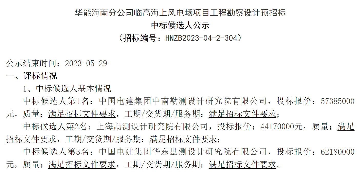 公告顯示,第一中標候選人:中國電建集團中南勘測設計研究院有限公司,投標報價:57385000元。第二中標候選人:上海勘測設計研究院有限公司,投標報價:44170000元。第三中標候選人:中國電建集團華東勘測設計研究院有限公司,投標報價:62180000元。