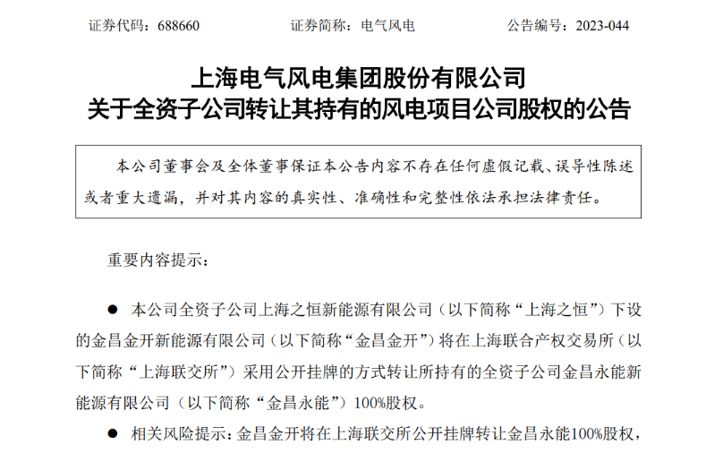 同日,電氣風(fēng)電發(fā)布《關(guān)于全資子公司轉(zhuǎn)讓其持有的風(fēng)電項目公司股權(quán)的公告》,電氣風(fēng)電全資子公司上海之恒下設(shè)的金昌金開將在上海聯(lián)合產(chǎn)權(quán)交易所采用公開掛牌的方式轉(zhuǎn)讓所持有的全資子公司金昌永能新能源有限公司(以下簡稱“金昌永能”)100%股權(quán),金昌永能持有金昌風(fēng)電項目(裝機容量為100MW)。