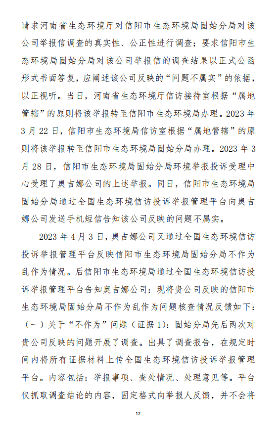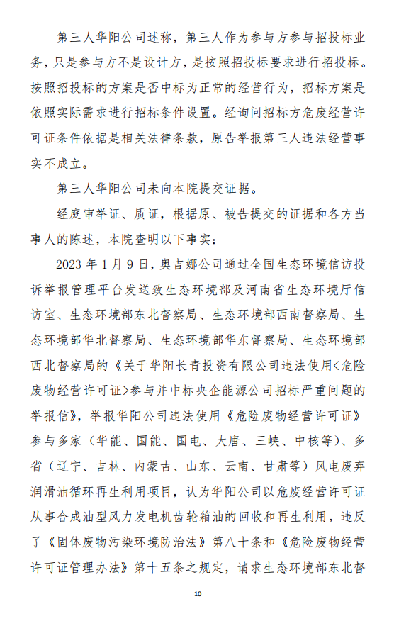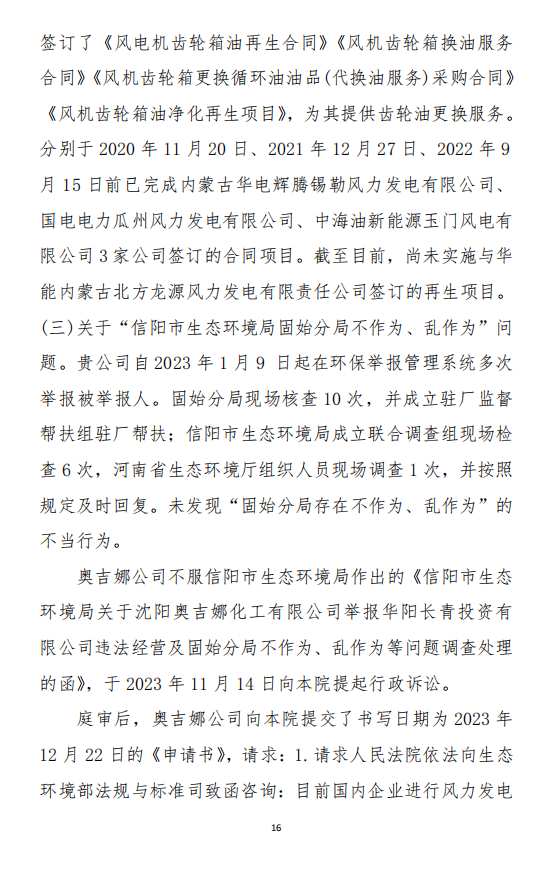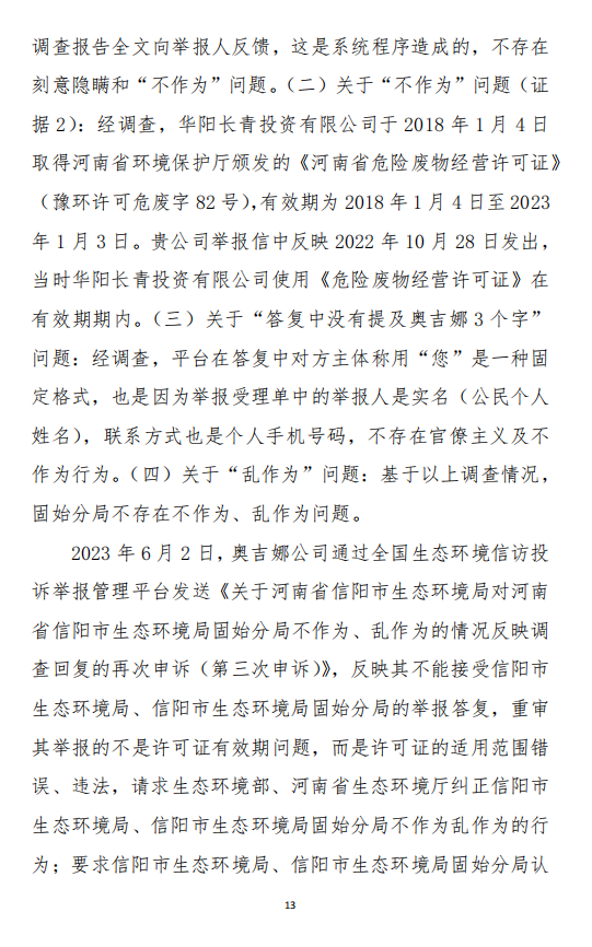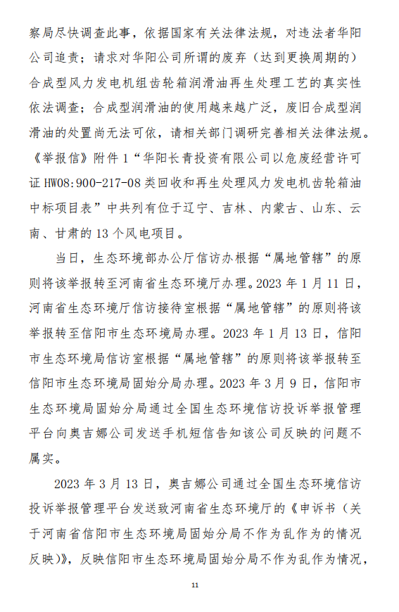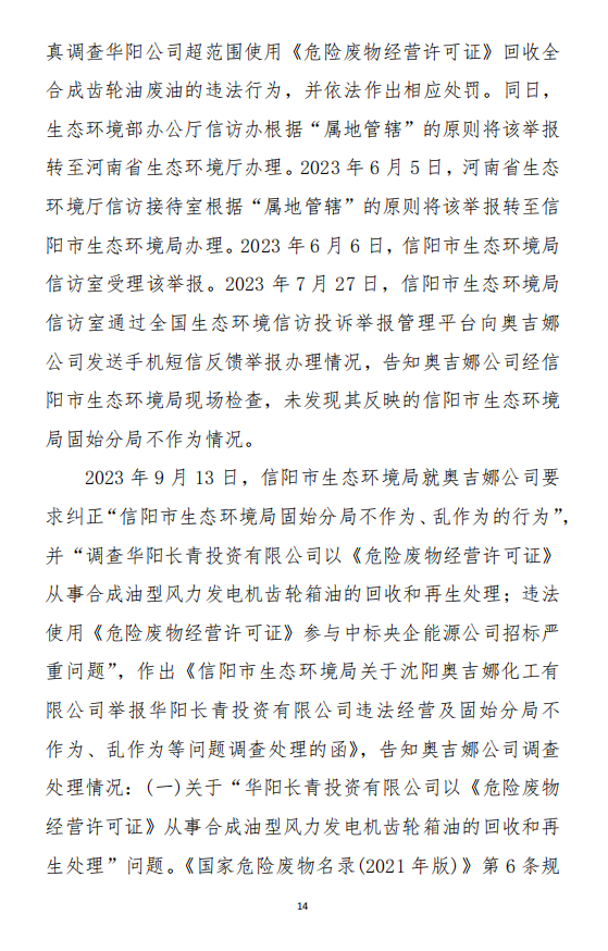 2023年3月9日,奧吉娜公司收到固始分局通過12369環(huán)境信訪平臺的短信答復(fù):“反映問題不屬實”。3月10日,奧吉娜公司向固始分局負(fù)責(zé)人電話詢問,其解釋稱:經(jīng)調(diào)查核實,華陽長青公司沒有再生風(fēng)電潤滑油銷售,出售的是新油。否定了奧吉娜公司的舉報內(nèi)容。對此,奧吉娜公司表示強烈不滿。3月11日,奧吉娜公司向環(huán)境部投訴固始分局的不作為和亂作為。2023年5月26日,奧吉娜公司收到12369環(huán)境信訪平臺的短信答復(fù)。答復(fù)部門為信陽環(huán)境局。令人啼笑皆非的是,答復(fù)稱,華陽長青的許可證有效期沒有問題,與舉報內(nèi)容風(fēng)馬牛不相及。2023年6月13日,奧吉娜公司再次向環(huán)境部提出申訴,指出,奧吉娜舉報的不是許可證有效期問題,而是許可證的適用范圍錯誤、違法。2023年7月27日,奧吉娜公司收到回復(fù)稱,經(jīng)信陽市生態(tài)環(huán)境局現(xiàn)場檢查,未發(fā)現(xiàn)固始分局不作為情況。2023年8月3日,奧吉娜公司向河南省生態(tài)環(huán)境廳(以下稱:環(huán)境廳)舉報信陽環(huán)境局包庇固始分局的行為。環(huán)境廳對此高度重視,有關(guān)處長和奧吉娜公司負(fù)責(zé)人進(jìn)行了面談。2023年9月13日,信陽環(huán)境局向奧吉娜公司致《信陽市生態(tài)環(huán)境局關(guān)于沈陽奧吉娜化工有限公司舉報華陽長青投資有限公司違法經(jīng)營及固始分局不作為、亂作為等問題調(diào)查處理的函》。函中:一是,以“齒輪箱”替換“齒輪箱油”,偷換概念;二是,做出了廢風(fēng)電合成(齒輪)油不屬于危險廢物的結(jié)論;三是,未發(fā)現(xiàn)固始分局存在不作為、亂作為的不當(dāng)行為。再次否定奧吉娜公司的舉報和投訴。