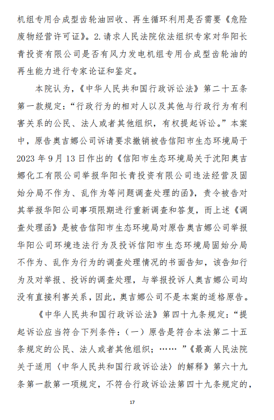2023年10月18日,奧吉娜公司依據(jù)《行政訴訟法》和《行政訴訟法解釋》,將信陽市環(huán)境局和第三人華陽長青公司訴至信陽市平橋區(qū)人民法院,請求法院:1、判決撤銷被告作出的《信陽市生態(tài)環(huán)境局關(guān)于沈陽奧吉娜化工有限公司舉報華陽長青投資有限公司違法經(jīng)營及固始分局不作為、亂作為等問題調(diào)查處理的函》;2、責(zé)令被告針對原告于2023年8月3日向被告申訴舉報華陽長青投資有限公司事項,限期進(jìn)行重新調(diào)查和答復(fù);3、請求人民法院判令被告2023年9月13日調(diào)查處理函認(rèn)定的廢合成油不應(yīng)按危險廢物有關(guān)規(guī)定進(jìn)行管理,違反法律規(guī)章的規(guī)定,無效。