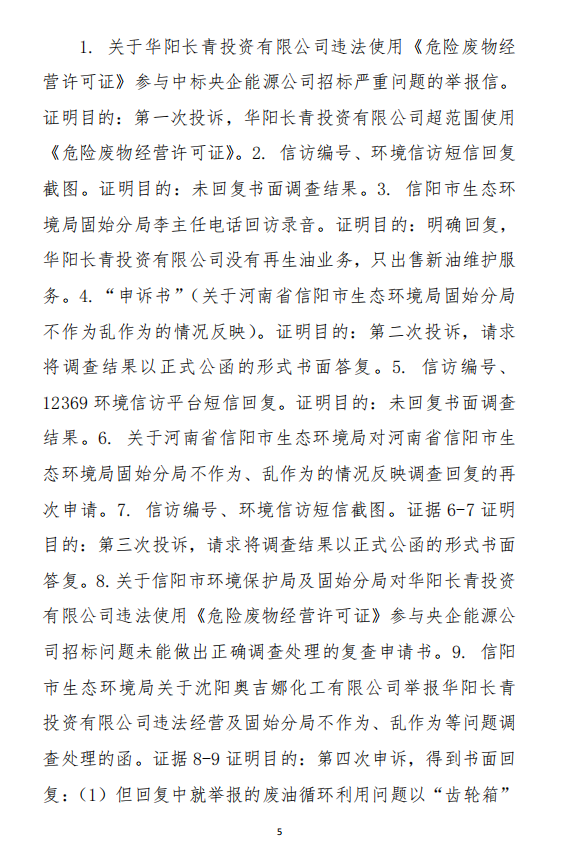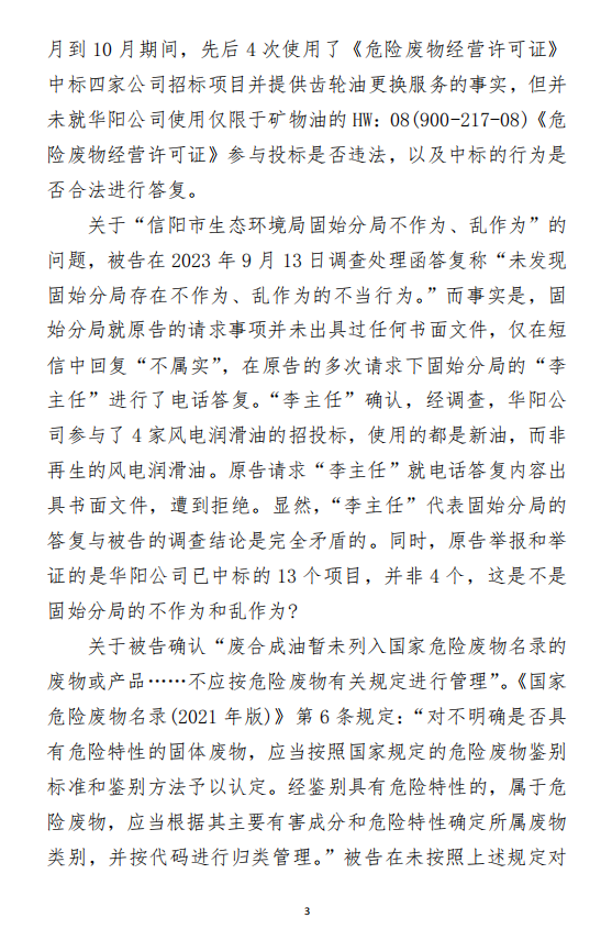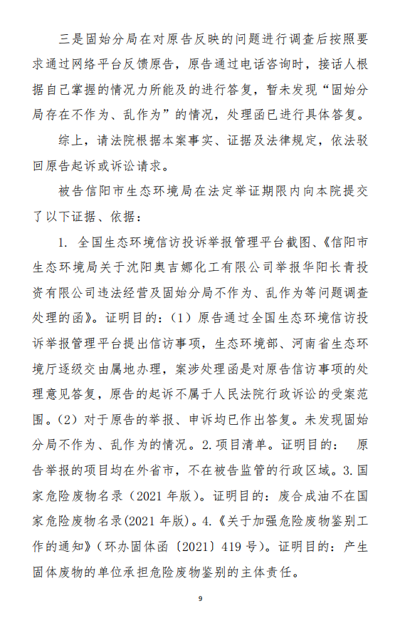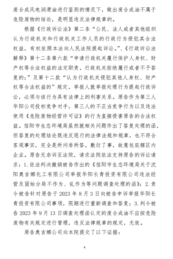 2、訴訟請求:請求人民法院判決撤銷被告作出的《信陽市生態(tài)環(huán)境局關(guān)于沈陽奧吉娜化工有限公司舉報華陽長青投資有限公司違法經(jīng)營及固始分局不作為、亂作為等問題調(diào)查處理的函》;責(zé)令被告對原告向被告舉報華陽長青投資有限公司事項,限期進(jìn)行重新調(diào)查和答復(fù);判令被告認(rèn)定的廢合成油不應(yīng)按危險廢物有關(guān)規(guī)定進(jìn)行管理違反法律規(guī)章規(guī)定,無效。
