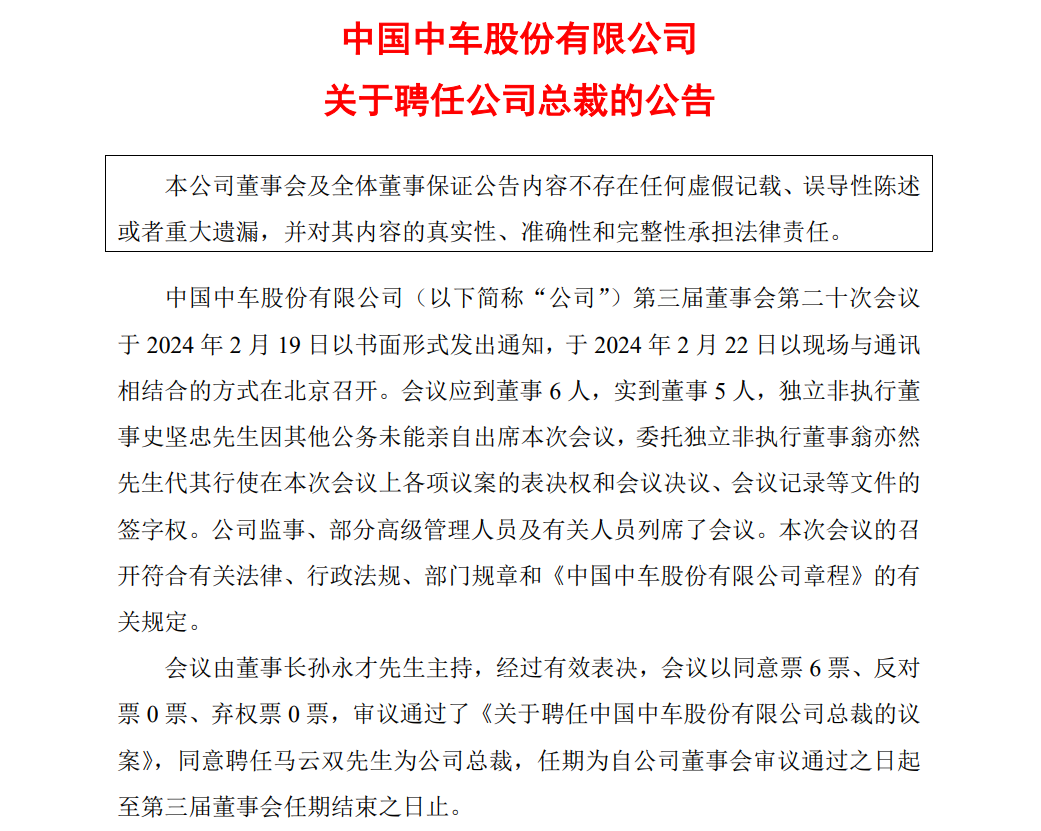 公告披露,中國(guó)中車召開第三屆董事會(huì)第二十次會(huì)議,審議通過了《關(guān)于聘任中國(guó)中車股份有限公司總裁的議案》,同意聘任馬云雙先生為公司總裁,任期為自公司董事會(huì)審議通過之日起至第三屆董事會(huì)任期結(jié)束之日止。
