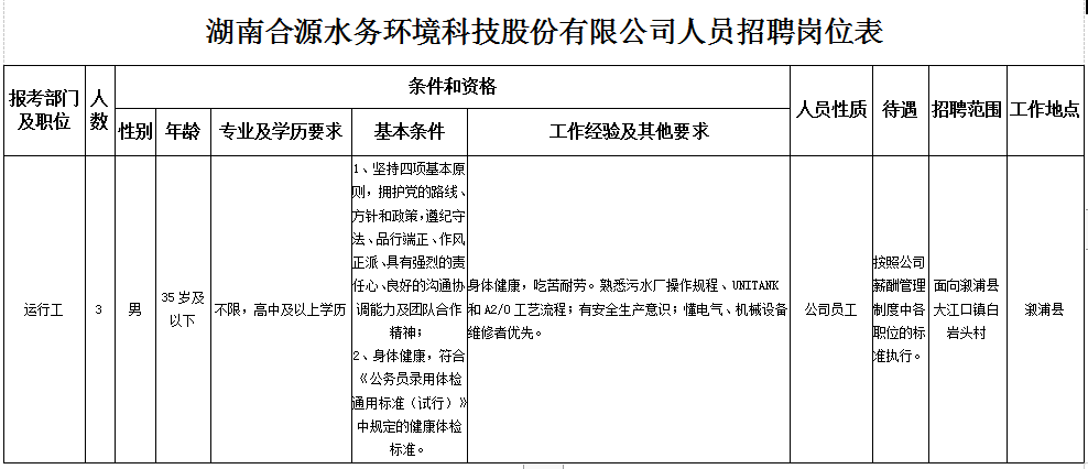 具體招聘崗位及應聘條件見《湖南合源水務環(huán)境科技股份有限公司人員招聘崗位表》。