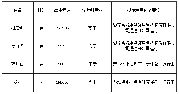 經(jīng)筆試、面試、體檢等程序,擬錄用潘啟全、張益華為湖南合源水務(wù)環(huán)境科技股份有限公司通道分公司運(yùn)行工,龔開石、楊浩為恭城污水處理有限責(zé)任公司運(yùn)行工現(xiàn)予以公示。公示時間為2019年11月7日—2019年11月9日,如有異議者請向湖南合源水務(wù)環(huán)境科技股份有限公司綜合管理部提出,過期不予受理。聯(lián)系電話:0745—2293111