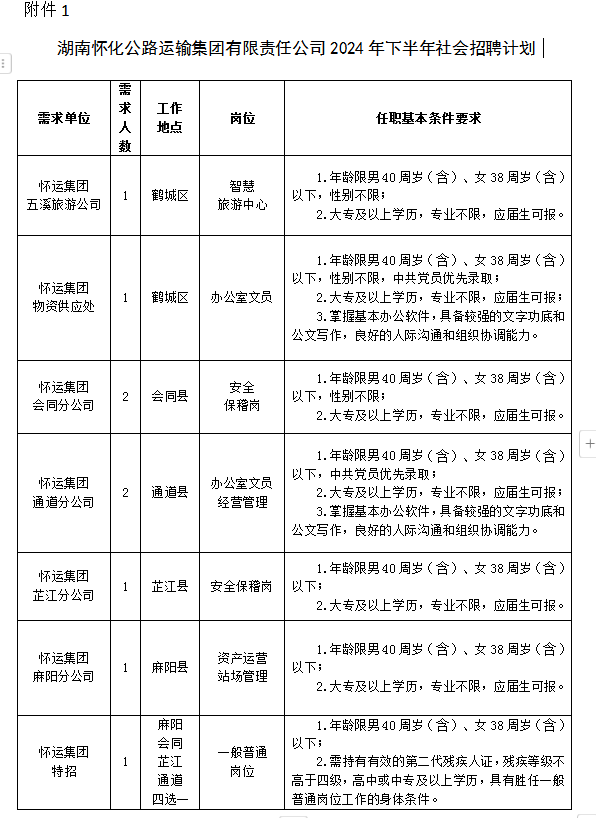 附件1:湖南懷化公路運輸集團有限責任公司2024年下半年社會招聘計劃