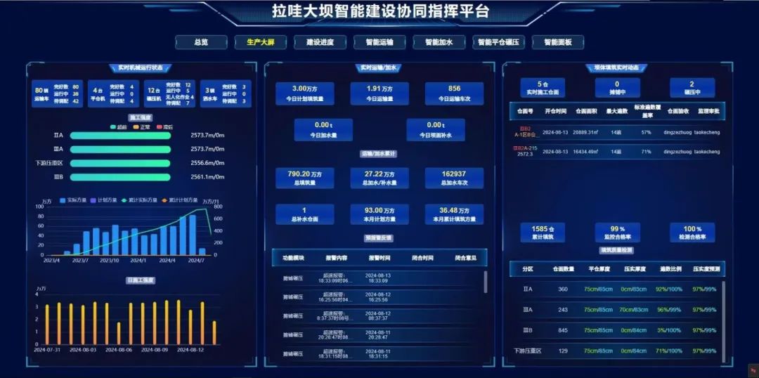 為保障世界級工程高效率高質量建設,項目團隊不斷優(yōu)化施工規(guī)劃,全面應用無人碾壓、智能物料、智能加水、智能攤鋪等技術聯(lián)動的智慧大壩協(xié)同指揮平臺,全方位提升大壩填筑效率與質量。截至目前,拉哇水電站大壩日填筑方量已突破3萬方,月填筑方量接近100萬方,月上升高度超過13.2米,為目前國內上升速度最快的混凝土面板堆石壩。