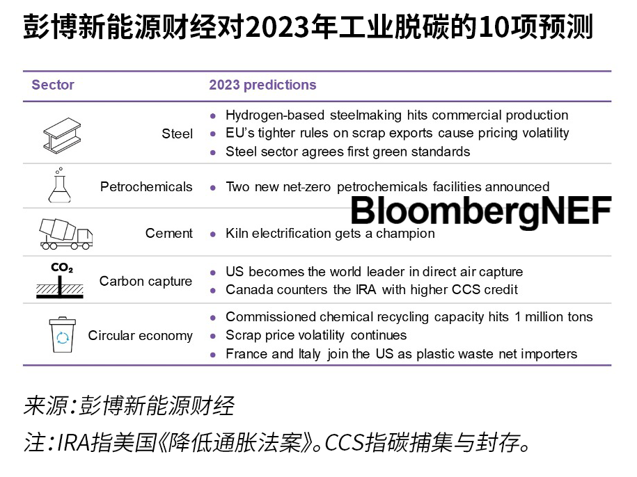 長期以來被認為難以減排的工業(yè)部門正在以比預期更快的速度脫碳。歐洲已經(jīng)開始綠鋼試點生產(chǎn),水泥廠正在宣布全面的碳捕集裝置,加拿大和法國正在建造凈零石化綜合設施。2023年還會有更多此類行動。