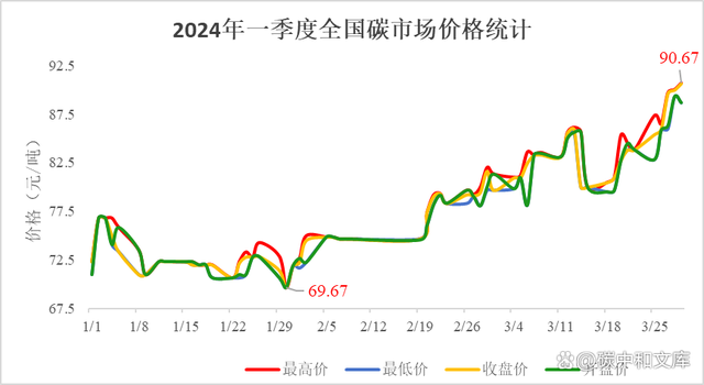 根據(jù)下圖可知,2024年一季度全國碳市場價格呈現(xiàn)一個波動上漲的趨勢,其中最高價出現(xiàn)在3月29日,最低價出現(xiàn)在1月30日,僅69.67元/噸。而平均最高價為78.22元/噸,最低平均價為77.13元/噸,平均開盤價為77.73元/噸,平均收盤價為77.42元/噸。