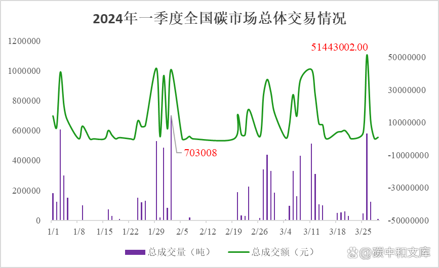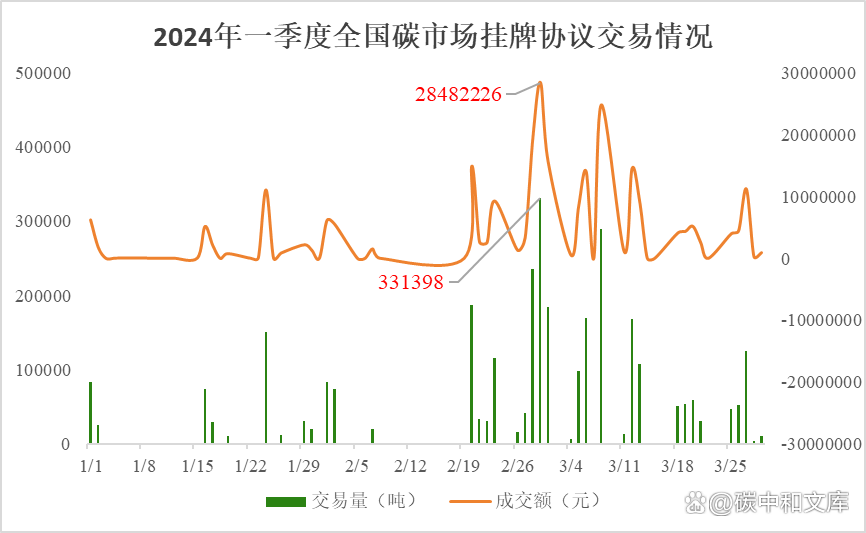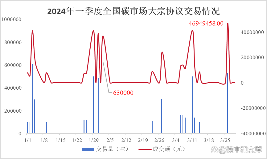 具體交易情況如下圖所示:2024年一季度碳市場掛牌協(xié)議交易碳配額總計3067072噸,交易金額達到了252341511.54元,交易均價為82.27元/噸。其中2024年2月29日交易量和交易金額最多,分別為331398噸和28482226元。大宗協(xié)議交易碳配額總計5548187噸,交易金額達到了420928187.9元,交易均價為75.87元/噸。其中2024年2月2日交易量最多達到了630000噸,2024年3月8日交易金額最大為46949458元。