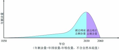 很明顯,碳中和年之前的各年排放量都大于吸收量,即從最大剩余量的達(dá)峰年開(kāi)始,每年未被吸收的剩余量逐年減少,直到剩余量為零的中和年,但歷年的總累積量仍然在持續(xù)增加。如果繼續(xù)在上述二維圖像(表一)上標(biāo)注,那么從達(dá)峰年的年最大剩余量開(kāi)始,曲線逐年下降,直到降為中和年的零剩余量,而下降曲線與年份長(zhǎng)度所形成的面積,則表示從達(dá)峰年到中和年所經(jīng)歷各年的碳剩余量總和。