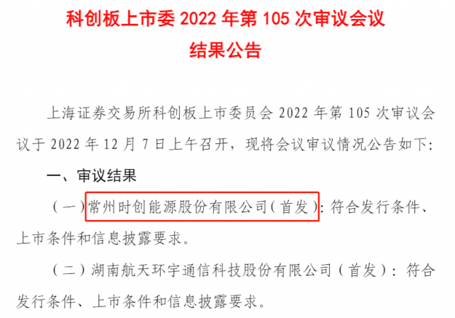 12月7日,上海證券交易所科創(chuàng)板上市委員會(huì)發(fā)布公告稱,常州時(shí)創(chuàng)能源股份有限公司首次公開發(fā)行股票申請(qǐng)符合發(fā)行條件、上市條件和信息披露要求。
