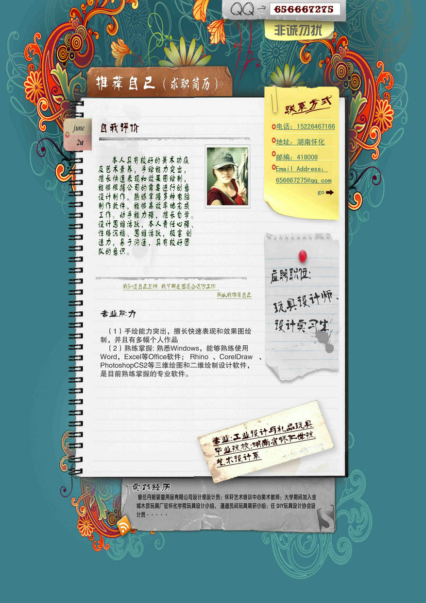 本人具有較好的美術(shù)功底及藝術(shù)素養(yǎng),手繪能力突出,擅長快速表現(xiàn)和效果圖繪制,能夠根據(jù)公司的需要進(jìn)行創(chuàng)意設(shè)計制作,熟練掌握多種電腦制作軟件,能夠高效率地完成工作。動手能力強(qiáng),擅長自學(xué)。設(shè)計思維活躍,本人責(zé)任心強(qiáng)、性格沉穩(wěn)、思維活躍,極富 創(chuàng)造力,易于溝通,具有較好團(tuán)隊的意識!