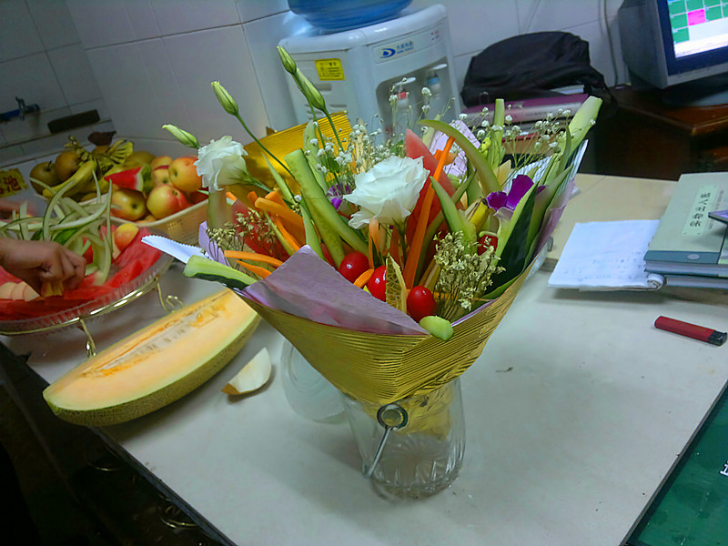 由于我工作的地方原料有限,里面只有黃瓜,胡蘿卜,圣女果,西瓜,哈密瓜,哎