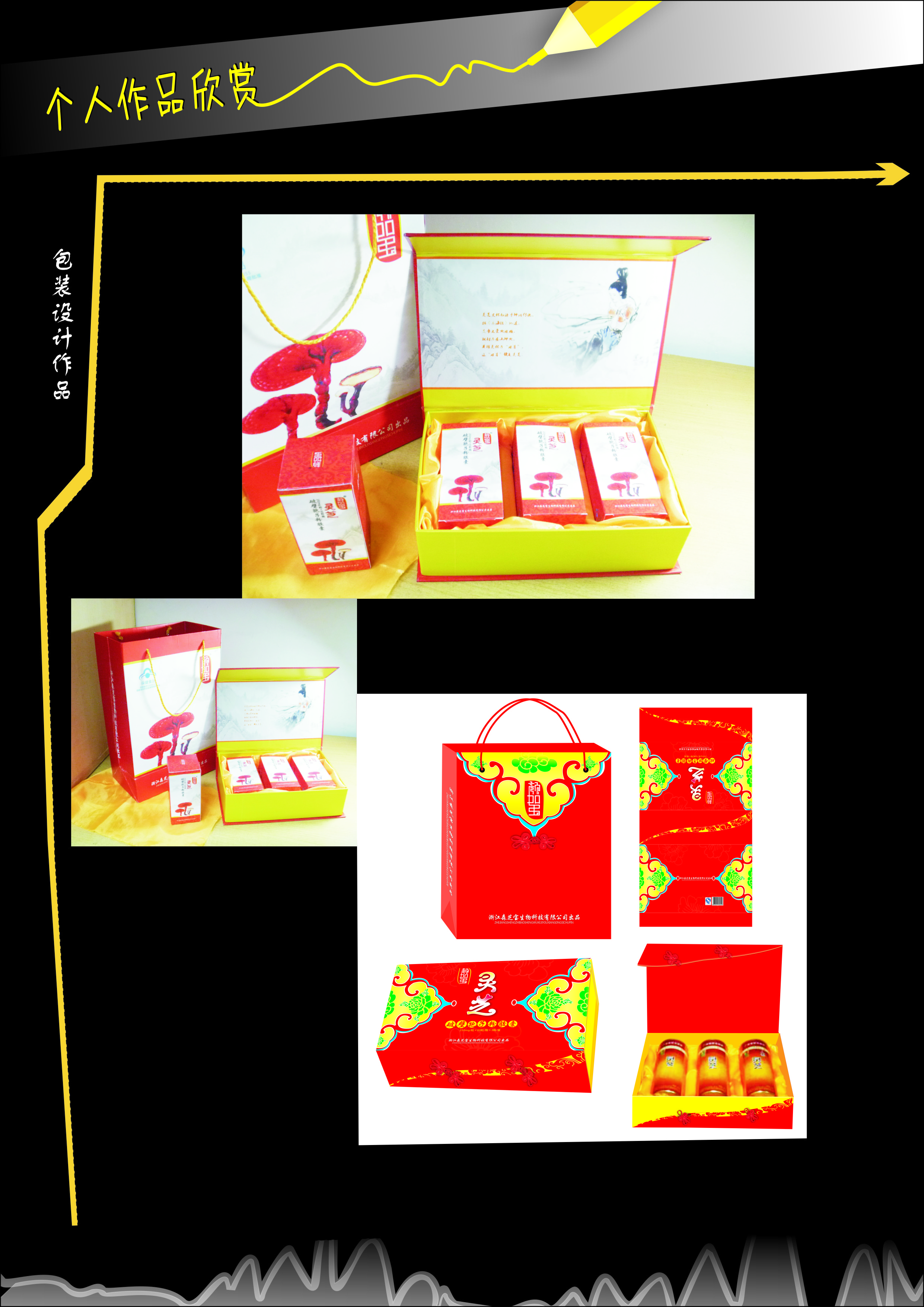 其中一幅作品是采用寫實(shí)的手法表現(xiàn)靈芝的形象,另外一幅作品是采用抽象的靈芝表現(xiàn)靈芝的內(nèi)涵,即靈芝就像如意一樣帶來身體健康和吉祥如意,包裝的整體形象注重體現(xiàn)一種傳統(tǒng)的中國(guó)氣韻。 |