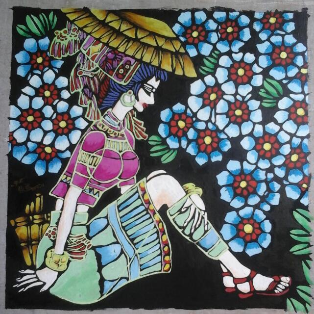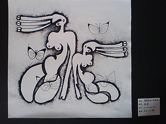 作品主要是在木板上作畫,利用油畫作底的白乳膠混水刷在木板上做底,再在木板上構(gòu)圖作畫,再選用水粉顏料將畫好的線描稿涂上顏色。 |