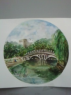 該作品首先考慮的是作品的構(gòu)圖,描繪的是校園里的拱形橋梁,一種陽光明媚的感覺。 |