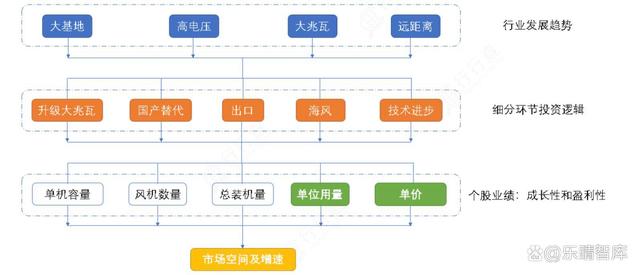 風(fēng)電行業(yè)的發(fā)展趨勢(shì)主要包括大兆瓦、高電壓、大基地和遠(yuǎn)距離,細(xì)分環(huán)節(jié)的邏輯主要從“升級(jí)大兆瓦+國產(chǎn)替代+出口+海風(fēng)+技術(shù)進(jìn)步”等五個(gè)方面去篩選。主要從量和價(jià)兩個(gè)方面判斷其未來的市場(chǎng)空間。