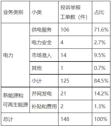 2022年9月份工單中,投訴和舉報(bào)類工單共148件,同比增加54.2%,環(huán)比減少31.5%。從反映內(nèi)容看,電力類125件,占84.5%,新能源和可再生能源類23件。具體情況見表6。