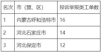 從各市的投訴舉報(bào)工單數(shù)量來看,內(nèi)蒙古呼和浩特市最多。數(shù)量前三名的市見表8。