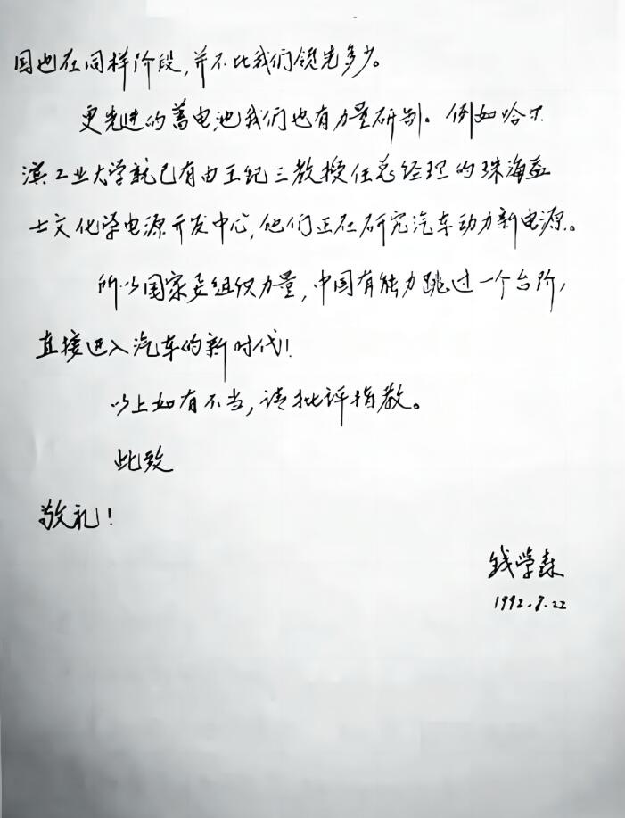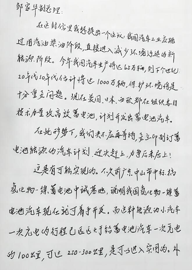 1992年,當(dāng)時已81歲高齡的錢學(xué)森寫信給時任副總理鄒家華,提出了一個高瞻遠(yuǎn)矚的建議:“我國汽車工業(yè)應(yīng)跳過用汽油柴油階段,直接進(jìn)入減少環(huán)境污染的新能源階段……到下個世紀(jì)20年代保護(hù)環(huán)境將是十分重要問題?,F(xiàn)在美國、日本、西歐都在組織各自技術(shù)力量攻高效蓄電池,計(jì)劃開發(fā)出蓄電池汽車。”
