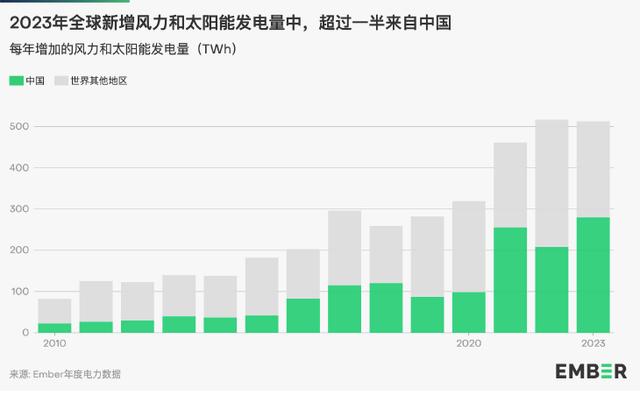 2023年,中國的太陽能和風力發(fā)電量占全球的37%,燃煤發(fā)電量占全球的一半以上。2023年中國新增風力和太陽能發(fā)電量占全球一半以上。如果沒有自2015年以來風力和太陽能發(fā)電量的增長,2023年中國電力行業(yè)的排放量將會提高21%。
