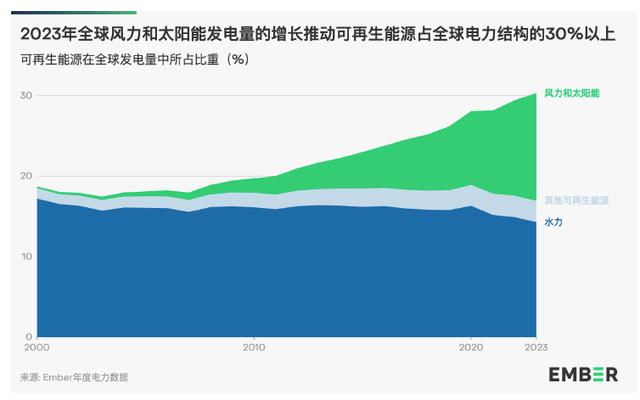 5月8日,根據(jù)全球能源智庫Ember的最新報告:2023 年,得益于太陽能和風力發(fā)電量的增長,可再生能源發(fā)電量在全球發(fā)電量中的占比達到了前所未有的30%。2023年或?qū)⒊蔀殡娏π袠I(yè)碳排放量達到峰值的標志性轉(zhuǎn)折點。