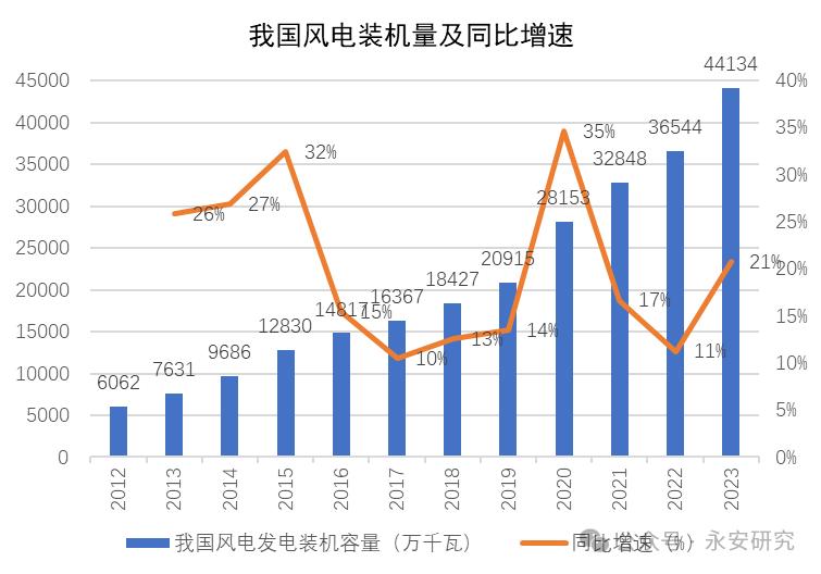 圖2、我國(guó)風(fēng)電裝機(jī)量及同比增速