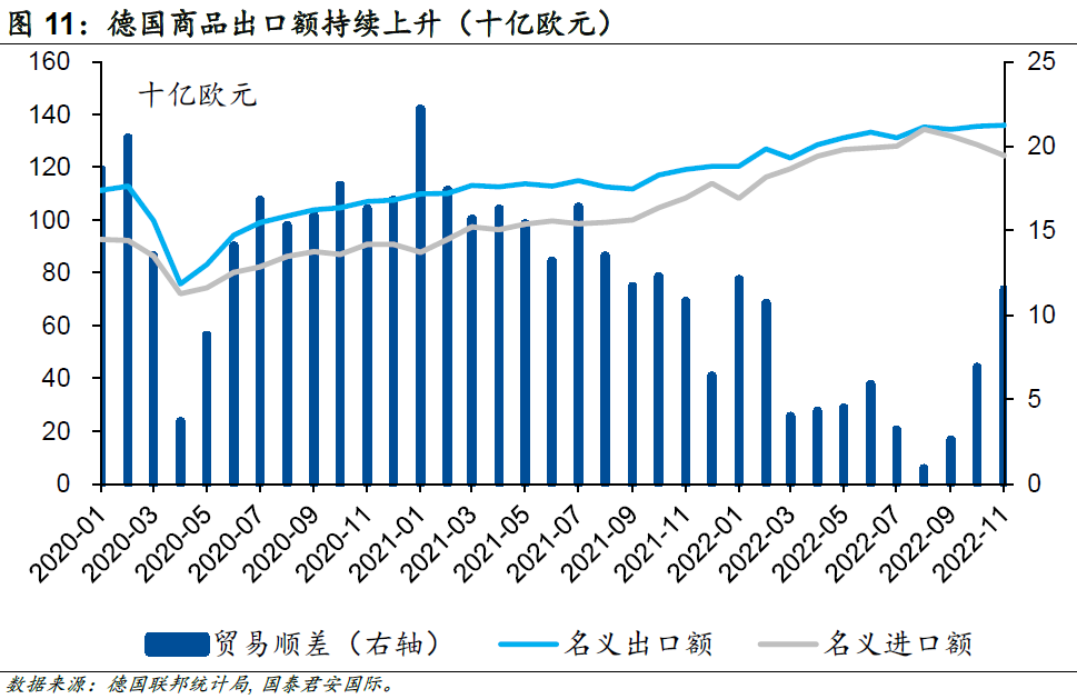 更加重要的是,為了應(yīng)對中長期能源危機,歐盟各國也開始加大對制造業(yè)的支持力度,制定了“能源系統(tǒng)數(shù)字化”計劃,該計劃預(yù)期在2030年前在基礎(chǔ)設(shè)施方面投資5,650億歐元,以大力發(fā)展光伏和新能源汽車產(chǎn)業(yè);除此以外,歐盟還加大了對液化天然氣產(chǎn)業(yè)的投資力度。德國作為歐洲經(jīng)濟的最重要組成部門,受益于政策支持,其工業(yè)生產(chǎn)并沒有受到太多能源問題的干擾,尤其是核心的資本貨物出口額在衰退預(yù)期的背景下持續(xù)增長。