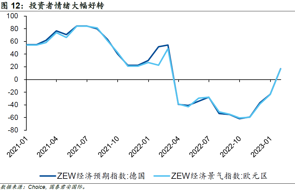往前看,反映歐元區(qū)及德國投資者情緒的指標(biāo)“ZEW經(jīng)濟景氣指數(shù)”大幅好轉(zhuǎn)。在能源問題好轉(zhuǎn)、中國經(jīng)濟向好的背景下,能源密集型企業(yè)及出口型企業(yè)的盈利預(yù)期也開始上修,2023年1月德國ZEW經(jīng)濟景氣指數(shù)錄得16.9,遠超預(yù)期值-15及前值-23.3。