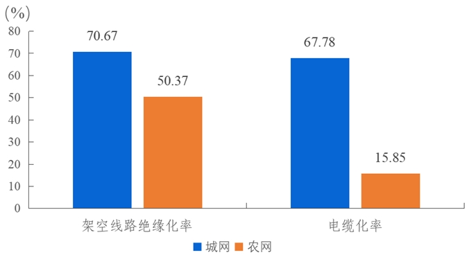 2023年,納入電力可靠性統(tǒng)計的10千伏等效總用戶數為1289.04萬戶,用戶總容量55.70億千伏安。城網架空線路絕緣化率、電纜化率分別為70.67%、67.78%,農網架空線路絕緣化率、電纜化率分別為50.37%、15.85%。